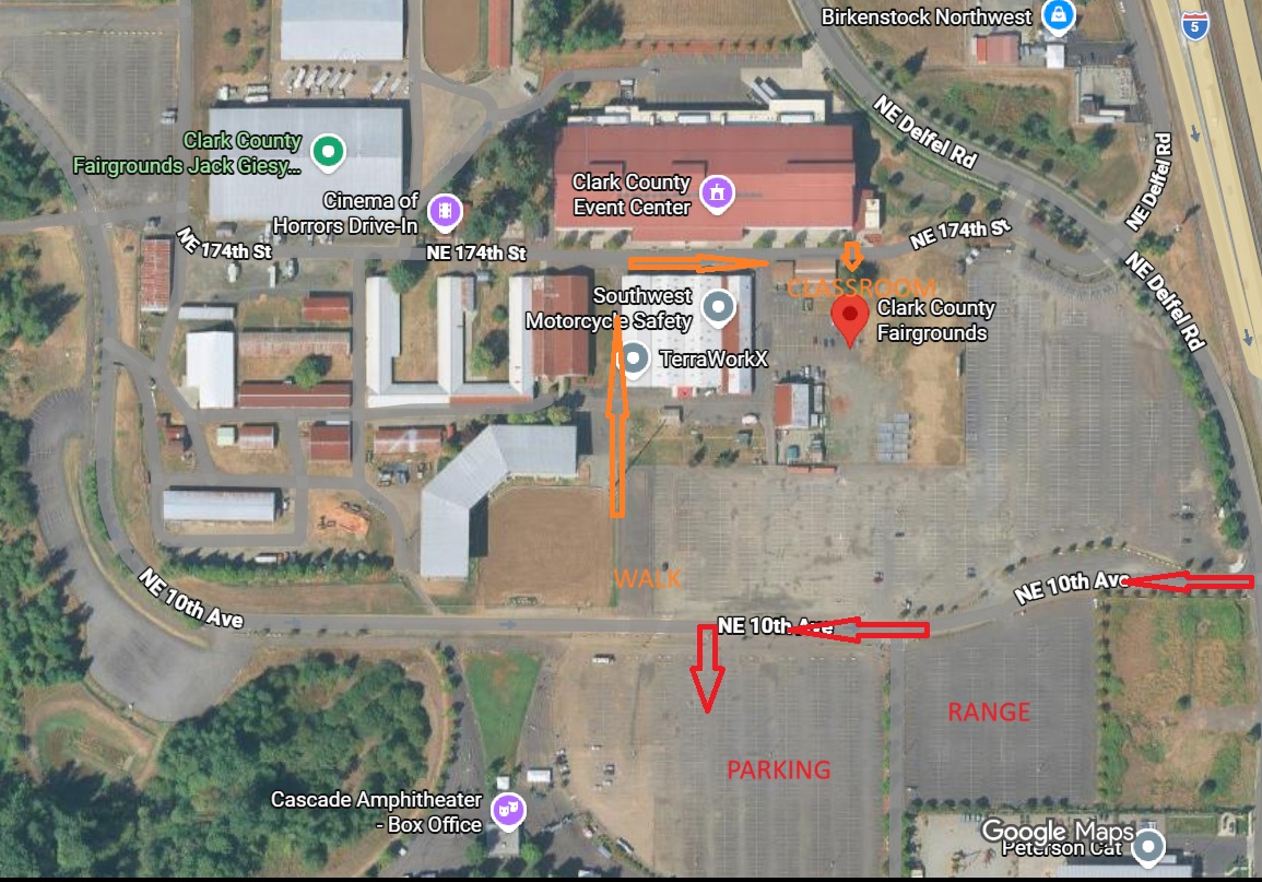 Classroom sessions & Knowledge Testing: Located inside the old fairgrounds office building (near the food court). Park in Lot A (see Classroom Parking location on map). Walk through gate. Classroom door is facing freeway with SW Motorcycle sign (Beige/tan building). Classroom is not located inside Events Center.